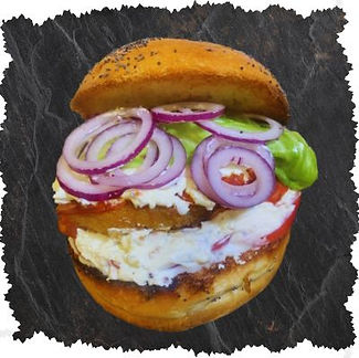 Sauce kebab, galette de poivrons façon basquaise enrobée de sa panure croustillante à base de graines de millet et de quinoa noir, tomates, oignons rouges, salade, fromage de brebis.